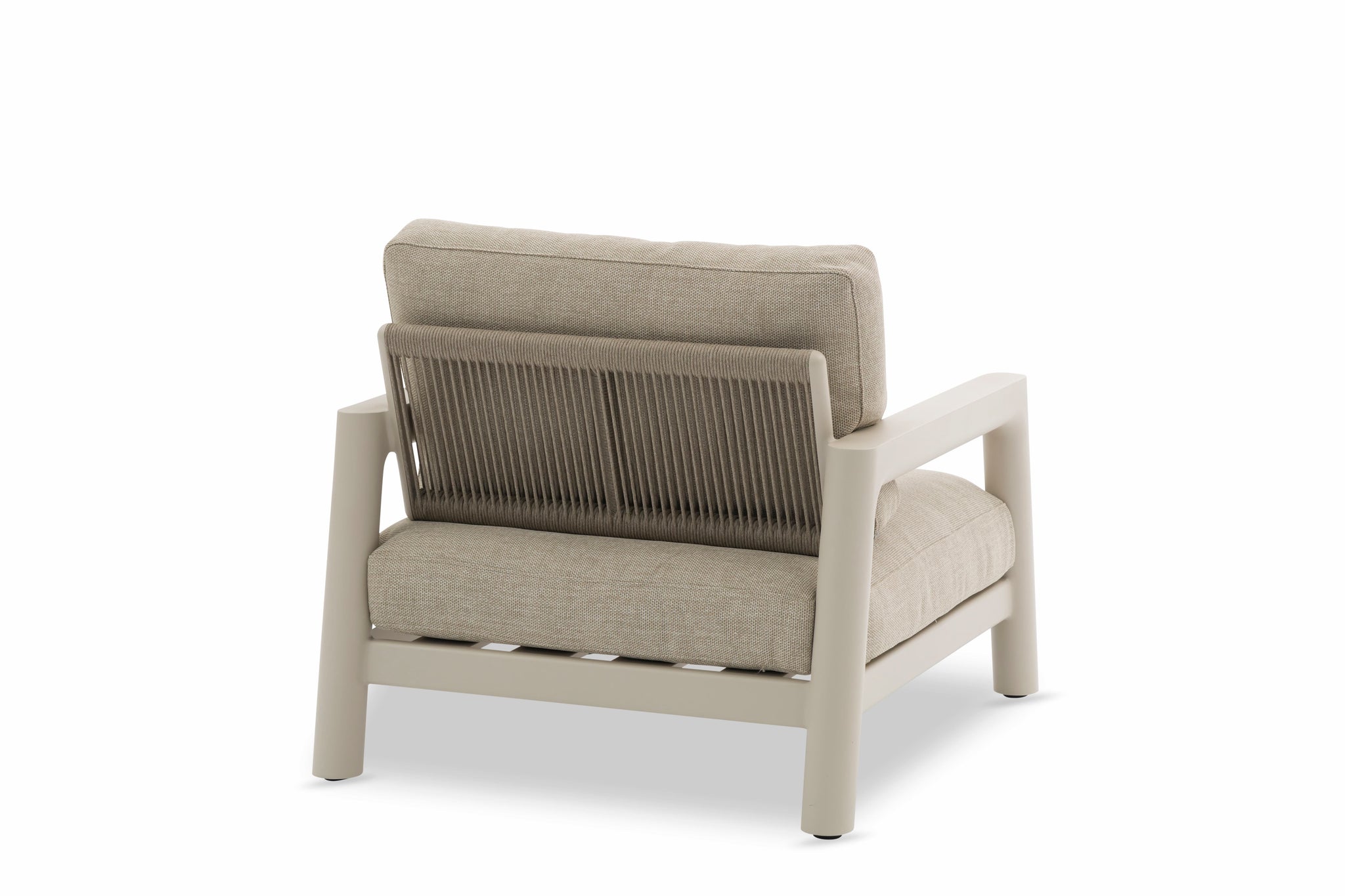 The lightweight aluminium frame is finished in a warm Mocha, with the seat back supported by 6mm diameter olefin rope in Latte, adding subtle texture and coastal warmth. Generously cushioned and naturally inviting, this lounge chair is designed for laid-back outdoor living—perfect for reading, relaxing or soaking up the afternoon sun.