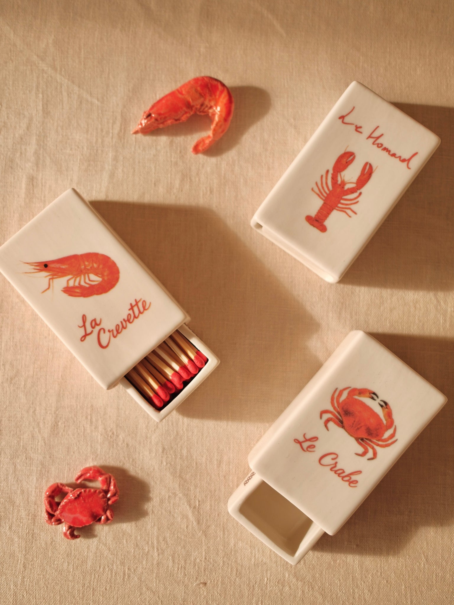 Featuring playful coastal motifs — Le Crabe and La Crevette — the soft ivory ceramic is accented with warm red detailing. A hidden sliding drawer holds classic red-tipped matches, blending function with refined decorative appeal.